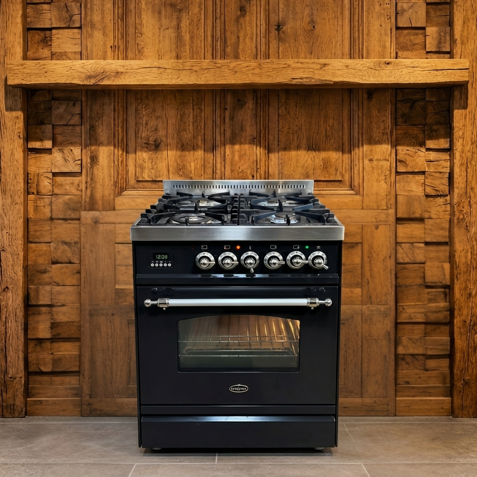 Specificaties Merk: Boretti · Type: Gasfornuis, vrijstaand · Kleur: Antraciet met chrome knoppen · Breedte: 60 cm · Diepte: 60 cm · Kookplaat: 4 messing branders (incl. wokbrander) · Pannendragers: Gietijzer · Ontsteking: Elektrisch · Thermokoppelbeveiliging: Ja · Oven: Multifunctioneel (hete lucht, grill) · Extra: Digitale timer, opberglade · Energieklasse: A · Aansluiting: Gas + elektrisch (oven)