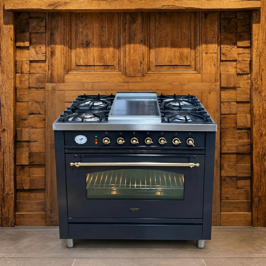 De combinatie van antraciet en messing is zeldzaam en verfijnd. De donkere behuizing geeft het fornuis een moderne ingetogen uitstraling, terwijl de messing knoppen en handvat een warme, klassieke touch toevoegen. Het resultaat is een fornuis dat zowel in een strakke als een landelijke keuken op zijn plek staat.