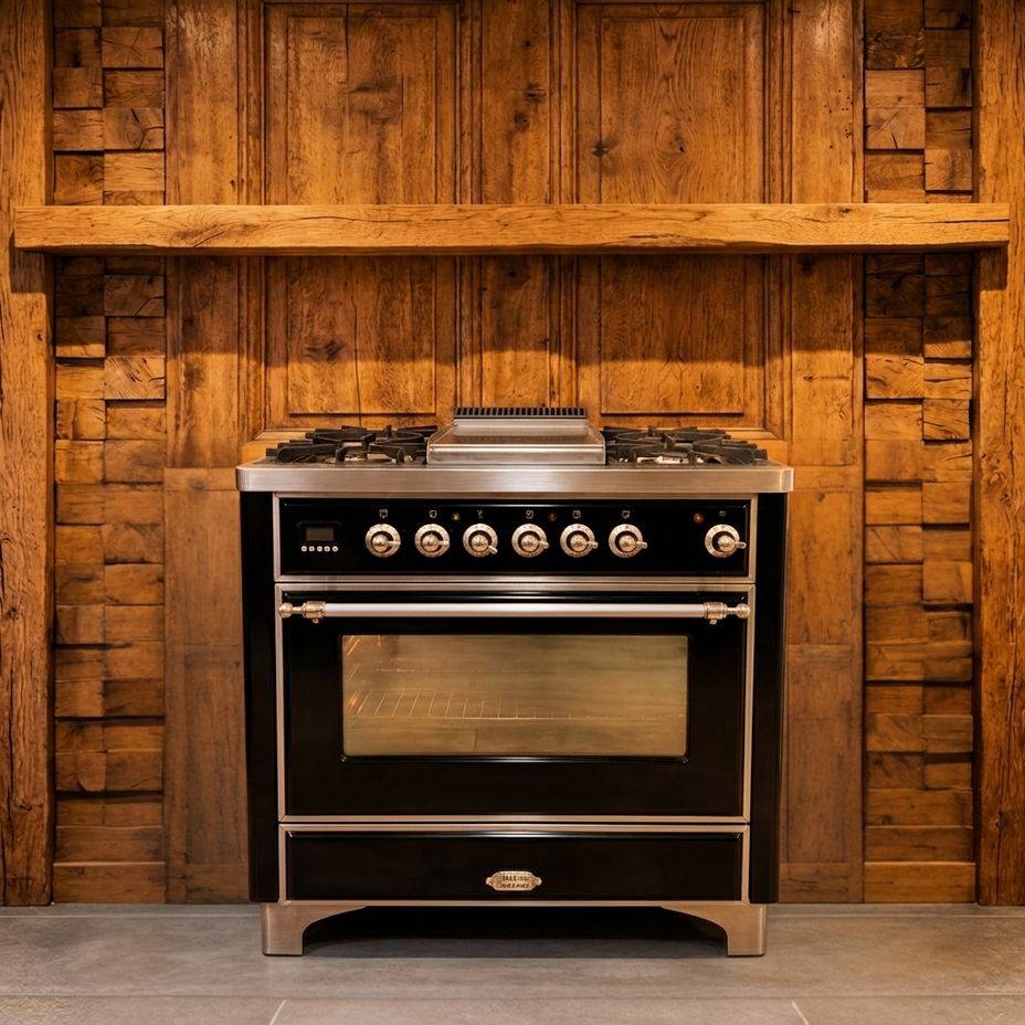 De Majestic in hoogglans zwart is het fornuis dat een keuken compleet maakt. Het contrast tussen het diepe zwart en de chrome details trekt direct de aandacht — maar de uitstraling is nog maar het begin.